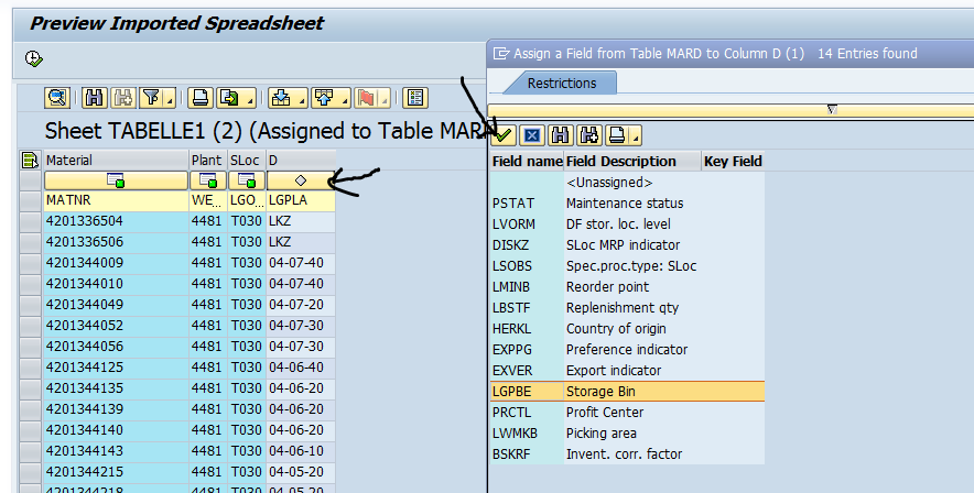 액셀 헤더라인에 적어놓은 필드명이 테이블 필드와 일치하면 알아서 자동 맵핑해줍니다. LGPLA 필드는 회색 아이콘으로 자동 맵핑이 안된 화면인데요. 이는 MARD 테이블에 LGPLA 란 필드가 없어서 자동 맵핑이 안된 내용입니다. 여기선 화살표가 가리키는 위쪽 버튼을 누릅니다.